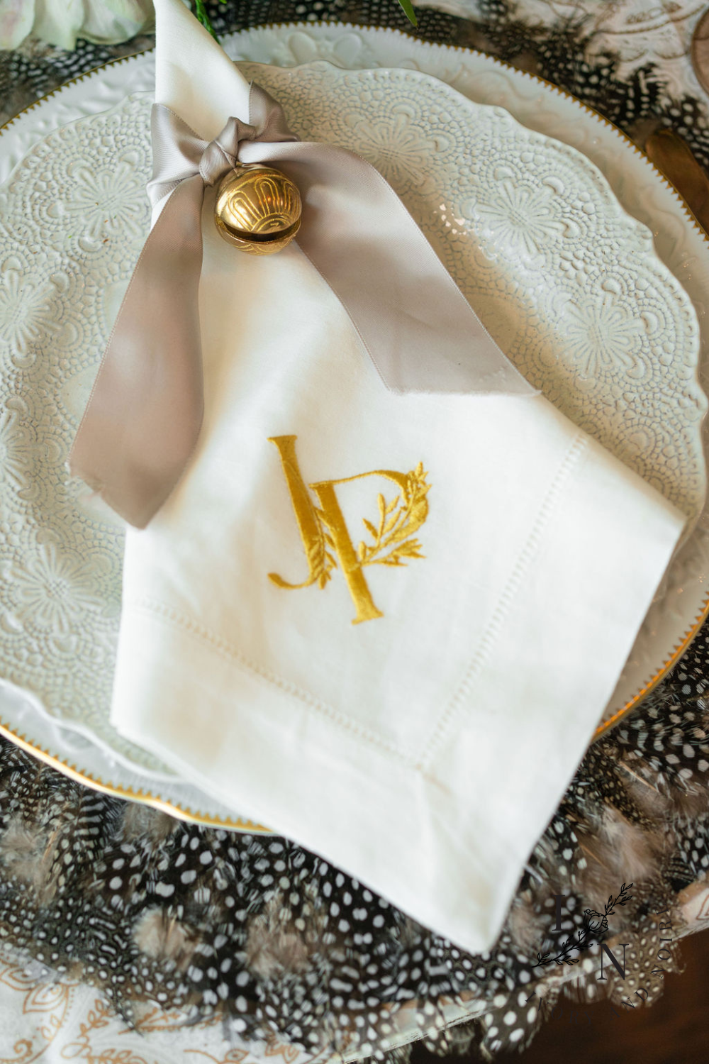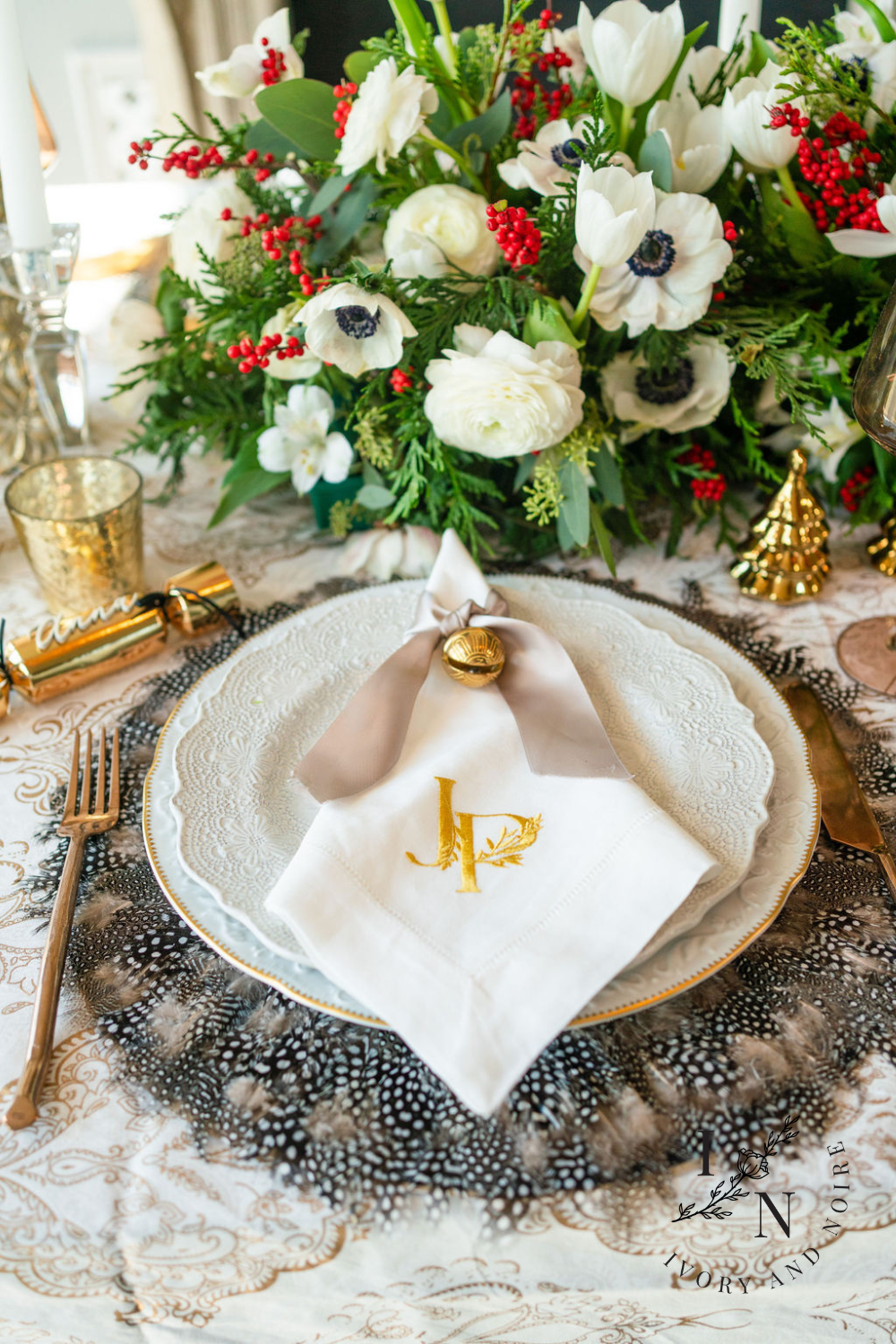 The napkin is a crisp white linen, monogrammed in gold. I tied it with a silky pale taupe ribbon and added a gold jingle bell for that final festive touch. Draped over the plate, it feels both elegant and playful.