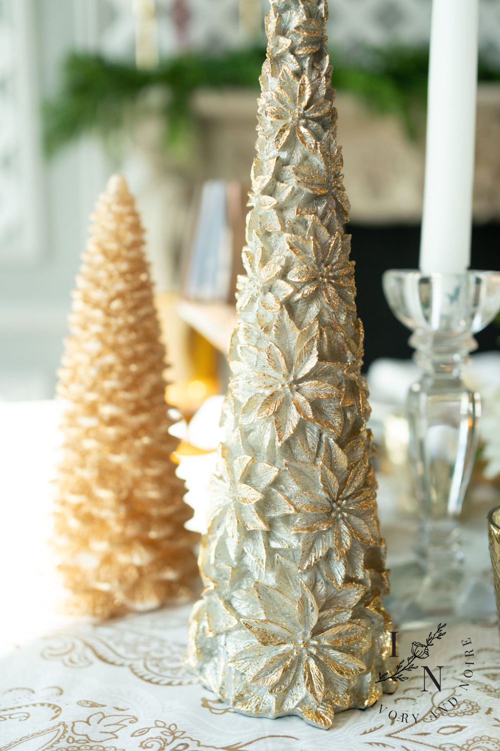 I used miniature gold Christmas tree figurines scattered around the centerpiece for a little sparkle and whimsy. These are an easy addition and can be placed among your plates, nestled near the candles, or even layered into the floral arrangement.